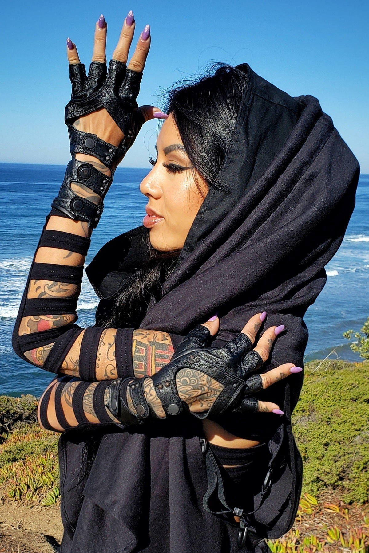 Sculptural and quietly striking, these mid-length leather gloves are crafted from soft goat leather and finished with hand-cast stud detailing for a refined, tactile edge. The fingerless silhouette and cutout design balance structure with flexibility, while snap straps create a secure, adjustable fit — a piece that feels both functional and artfully constructed.