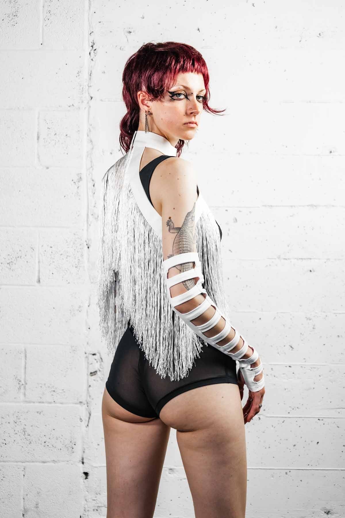 Clean lines meet quiet edge. The Cage Arms in white cotton bring the signature strapwork of the collection to your arms, creating a striking layered look that feels both sculptural and effortless. Designed with hand-placed straps and a secure elastic top, they stay comfortably in place whether worn as thumb-through gloves or styled higher as gauntlets.