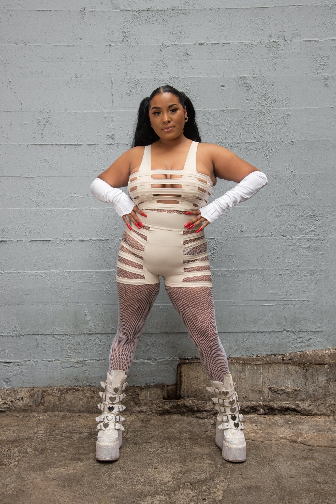 Clean, striking, and ready for movement — the Delila Curve Shorts in swim-ready nylon bring the signature ladder side detailing into a fresh white palette. Designed with a supportive high waist and thoughtful coverage, they balance bold design with all-day comfort whether styled poolside, festival-ready, or layered into your Cage Collection looks.