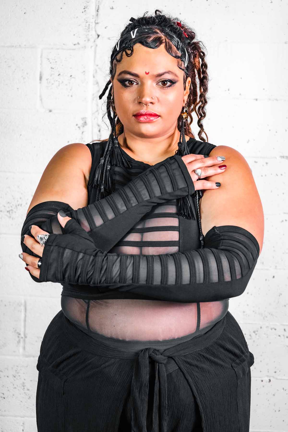 Sleek, graphic, and designed for layering — the Gamut Gloves bring subtle edge through a mix of cotton and sheer mesh with signature striped detailing along the front. The elbow-length silhouette creates a refined line whether worn smooth or softly slouched, while the silicone grip helps keep them comfortably in place through movement.