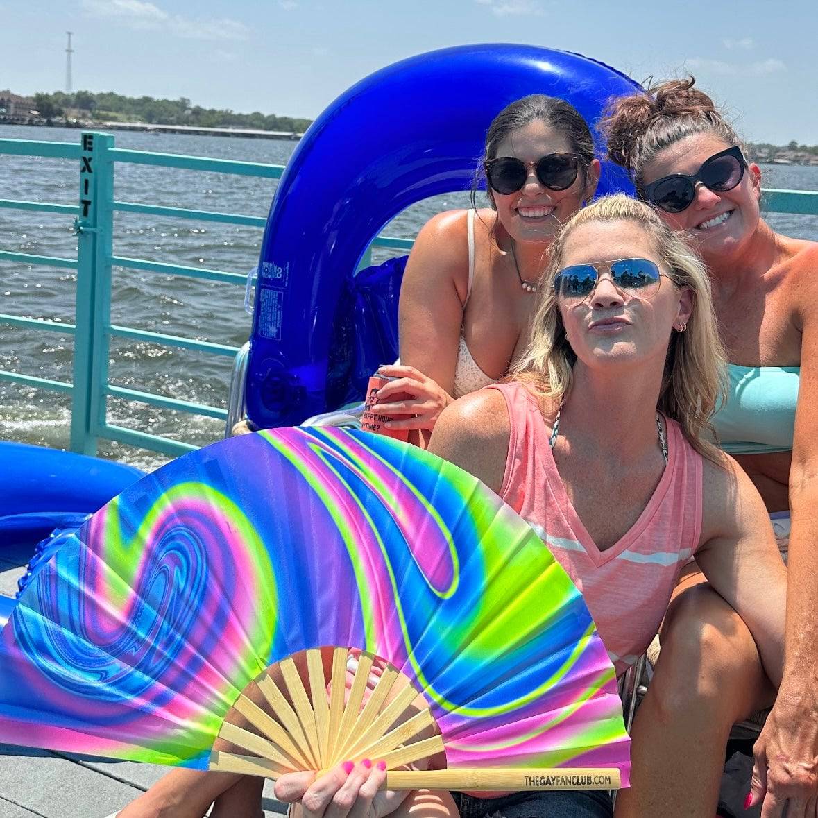 โข UV-reactive bamboo folding fan with swirling lava-lamp design