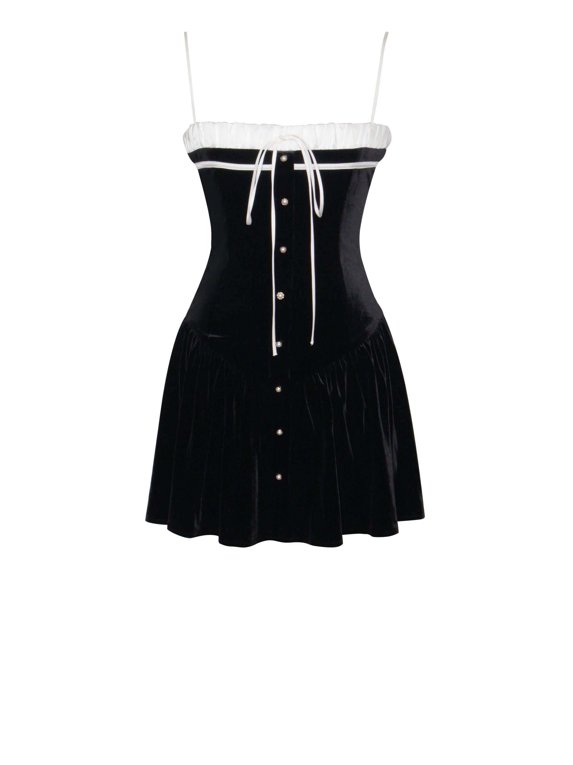 The Velvet Hour Corset Mini is your modern classic — crafted in luxe stretch velvet with duchess satin detailing for a sculpted, elevated finish. Designed with a built-in corset to define the waist, this mini features a dramatic drop “V” waistline and a soft A-line skirt that balances structure with movement.