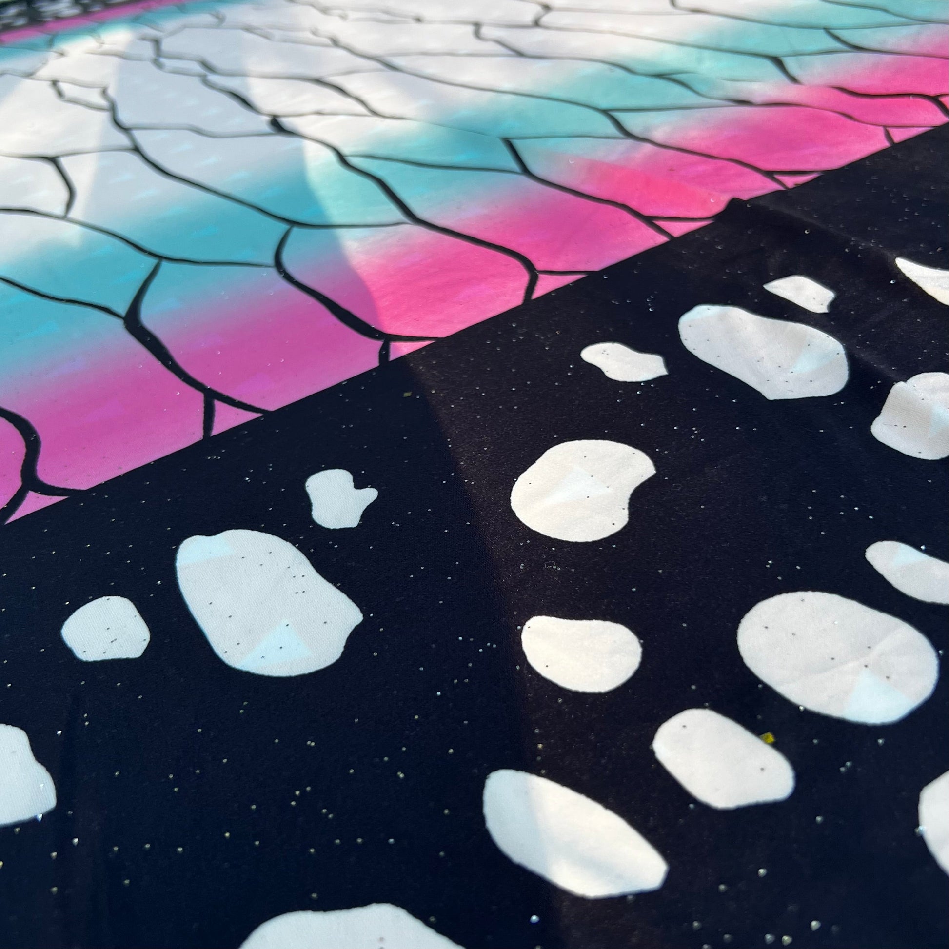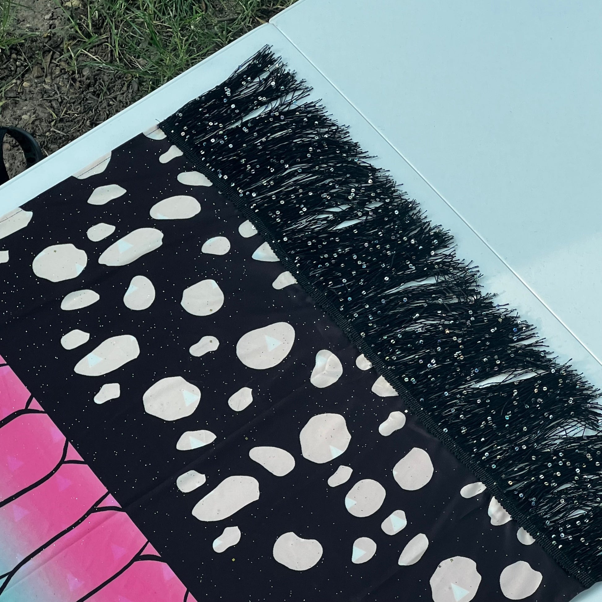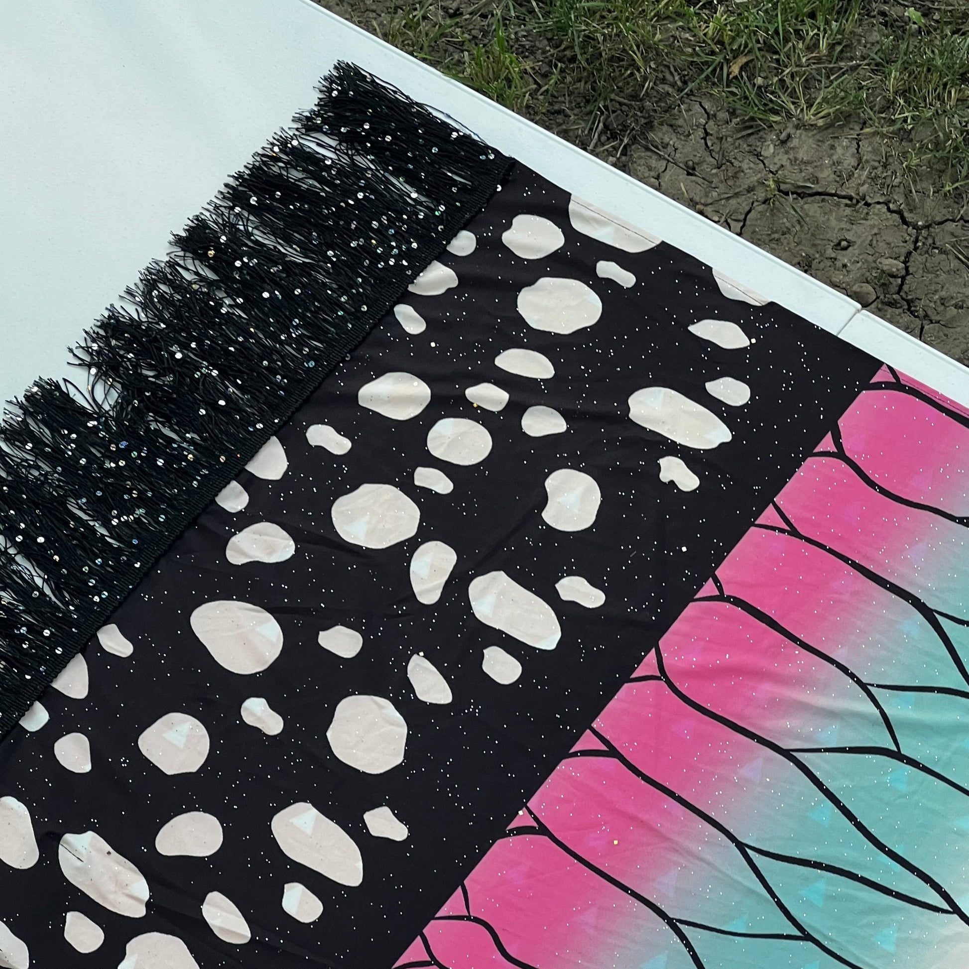 Immerse yourself in a shimmering galaxy with our Galactic Thunderfly Pashmina. Its permanent holographic glitter reflects the colors around you, while its lightweight and bouncy fabric drapes effortlessly for a cooling and flowy feel. Perfect for festivals, this one-of-a-kind piece adds a touch of unique luxury to any outfit.