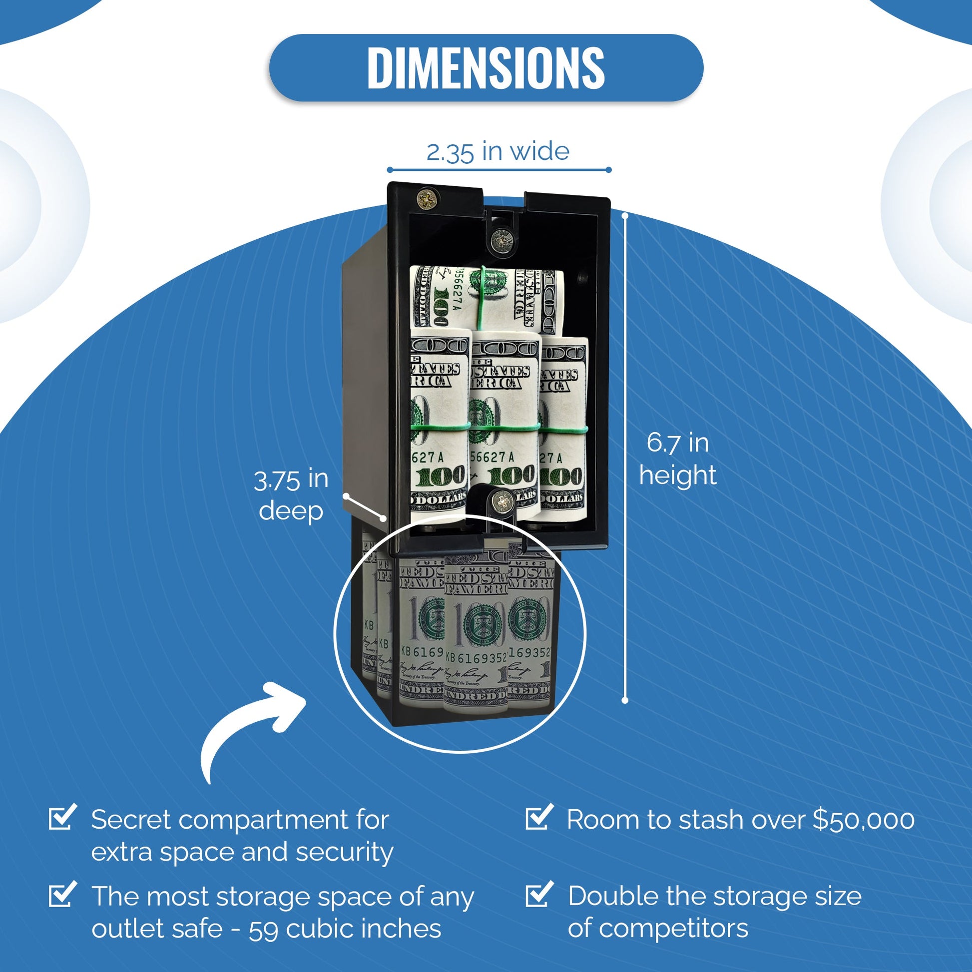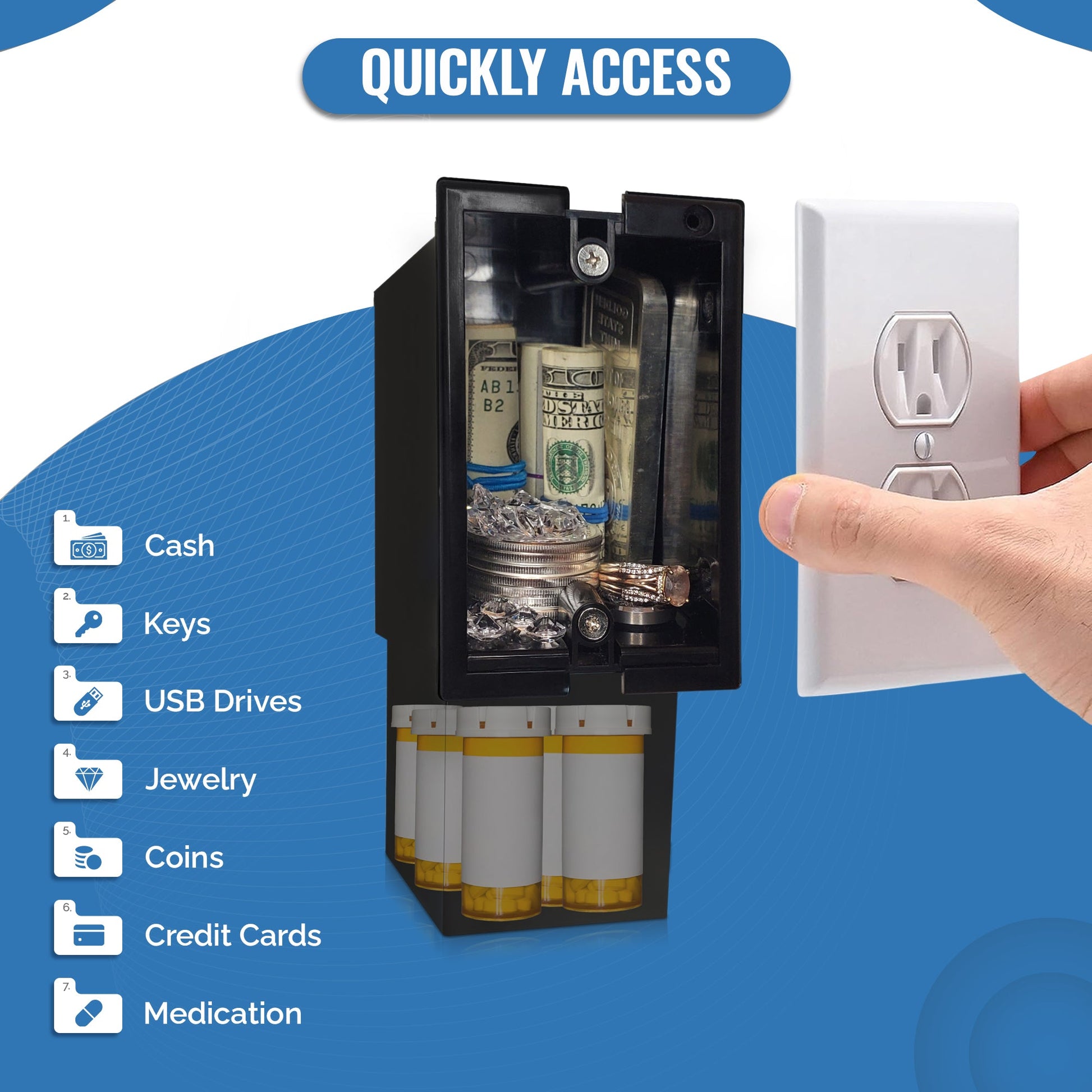 A convincing outlet exterior with a removable magnetic faceplate reveals a drop-down storage compartment inside. Expanded interior capacity allows for generous storage while maintaining a low-profile appearance among existing outlets.